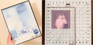 Start by unwrapping and popping out the glass of an 8.5×11″ front-loading document frame. Set the glass on the self-healing mat – it’s not essential, but I found it makes it WAY easier to center your material when applying to the glass. I even placed an album art sticker on the mat so all I have to do is line up the new one on the glass to that one – this helped me speed up the process a lot!!